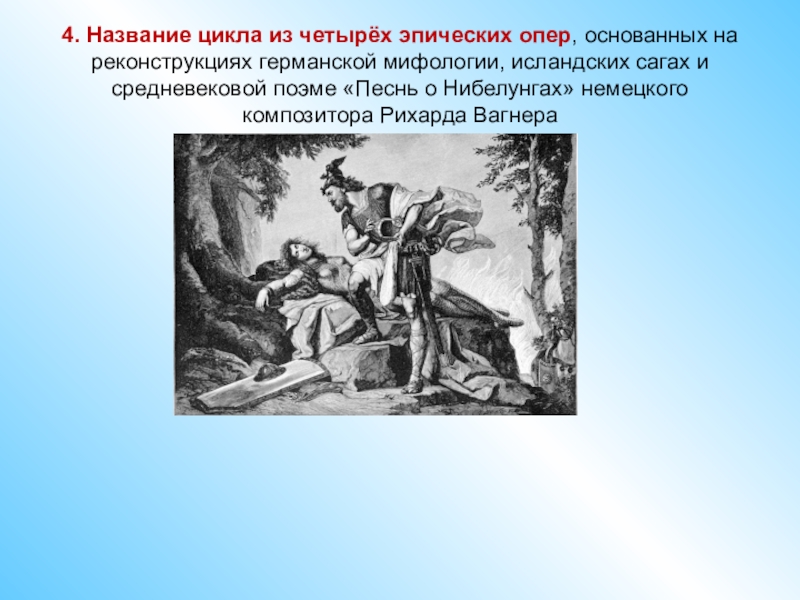 4. Название цикла из четырёх эпических опер, основанных на реконструкциях германской мифологии, исландских сагах и средневековой поэме «Песнь о Нибелунгах» немецкого