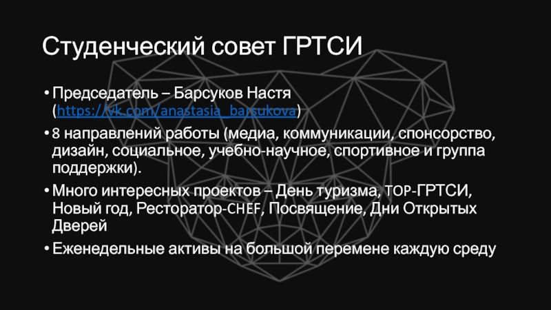 Студенческий совет ГРТСИПредседатель – Барсуков Настя (https://vk.com/anastasia_barsukova)8 направлений работы (медиа, коммуникации, спонсорство, дизайн, социальное, учебно-научное, спортивное и
