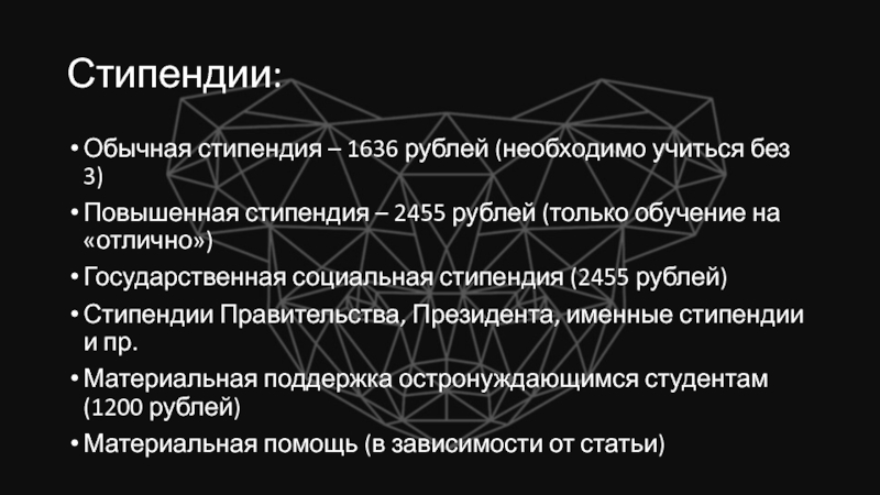 Стипендии:Обычная стипендия – 1636 рублей (необходимо учиться без 3)Повышенная стипендия – 2455 рублей (только обучение на «отлично»)Государственная