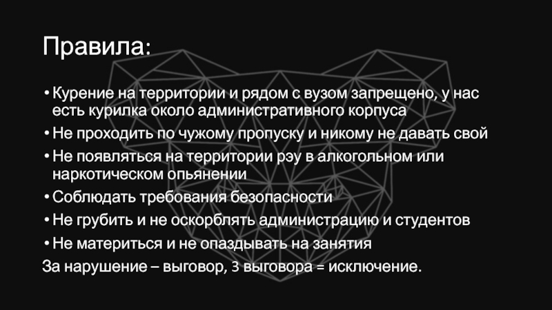 Правила:Курение на территории и рядом с вузом запрещено, у нас есть курилка около административного корпусаНе проходить по