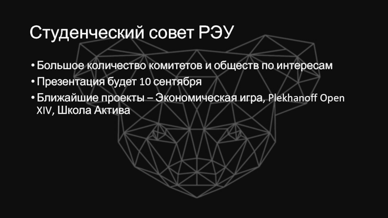 Студенческий совет РЭУБольшое количество комитетов и обществ по интересамПрезентация будет 10 сентябряБлижайшие проекты – Экономическая игра, Plekhanoff