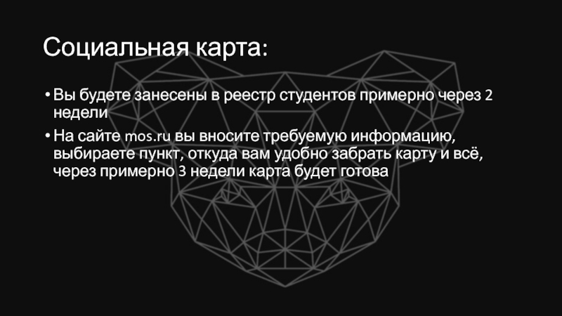 Социальная карта:Вы будете занесены в реестр студентов примерно через 2 неделиНа сайте mos.ru вы вносите требуемую информацию,