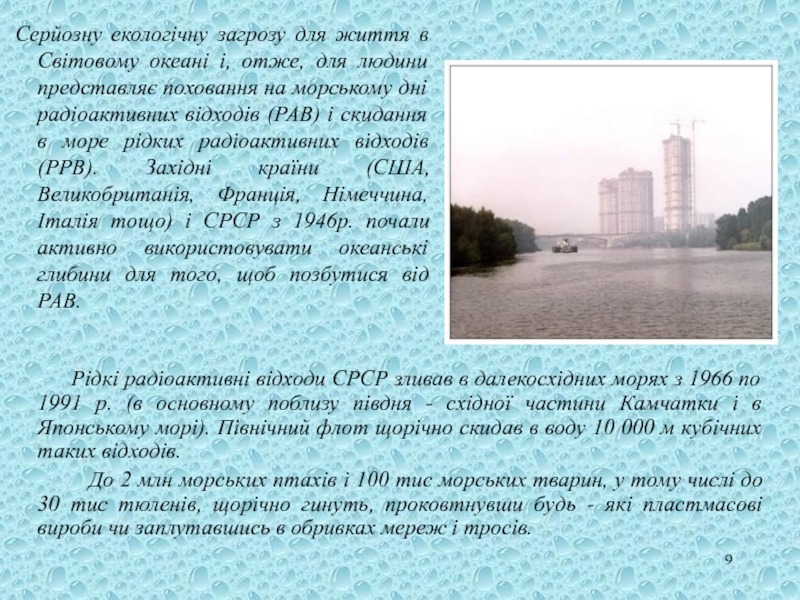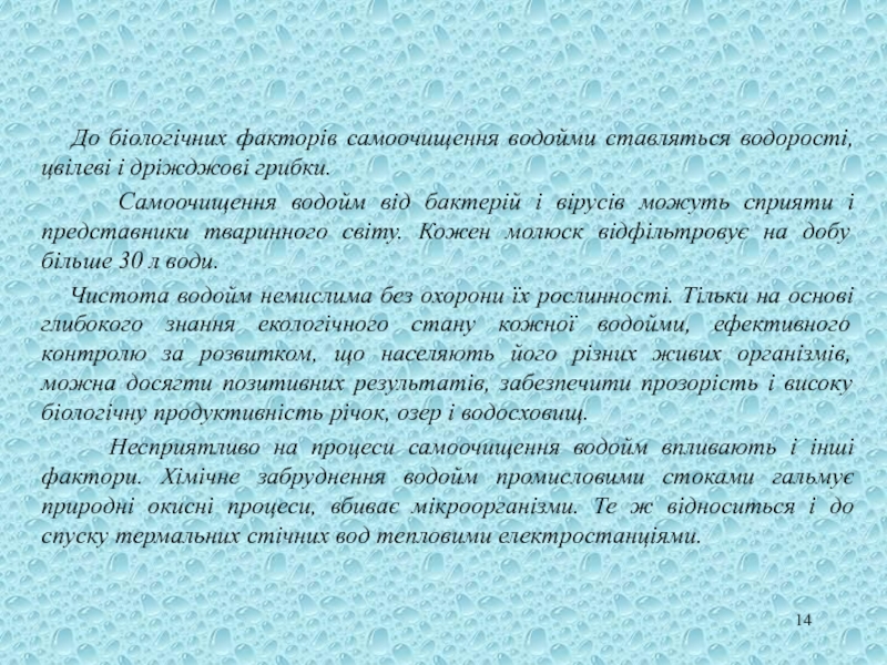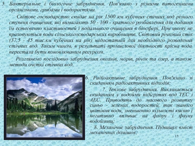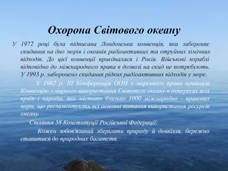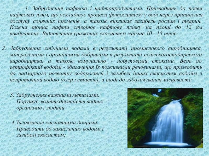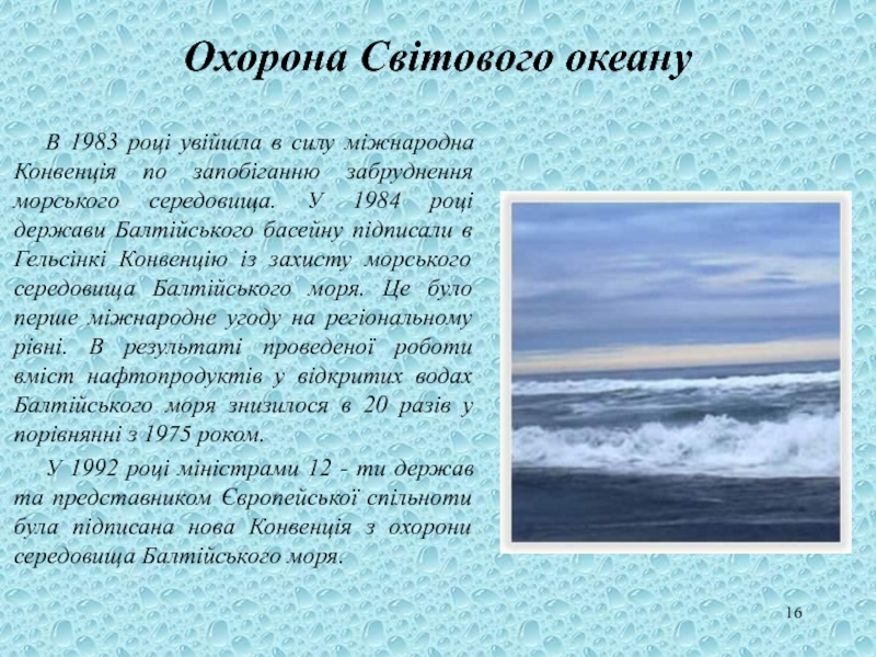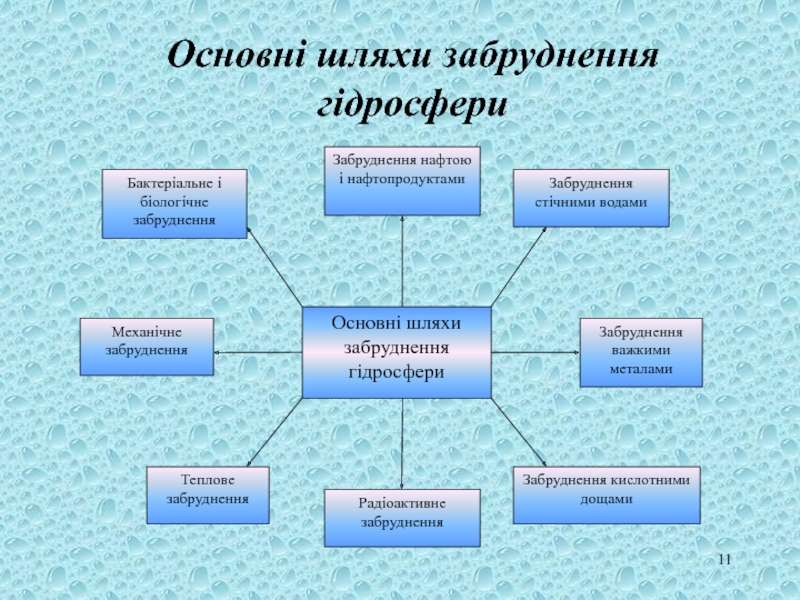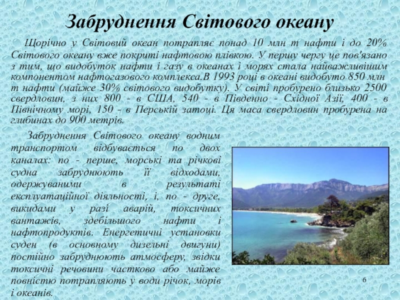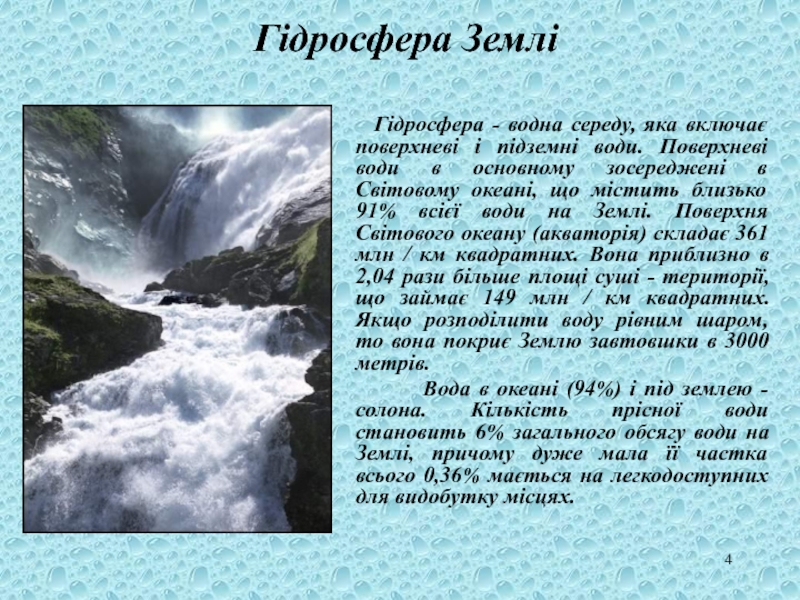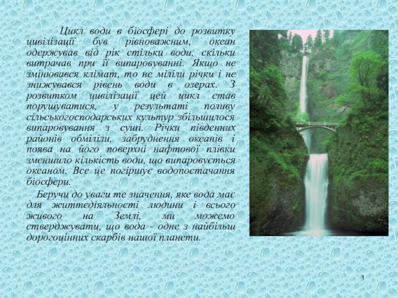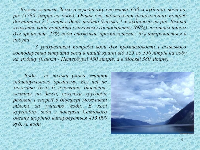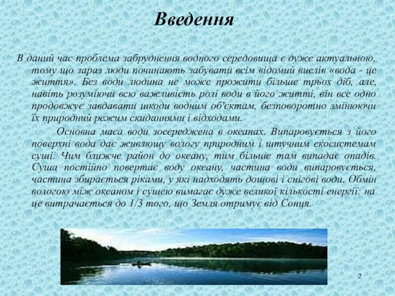 вислів «вода - це життя». Без води людина не може прожити більше трьох діб, але, навіть розуміючи всю важливість ролі води в його житті, він все одно продовжує завдавати шкоди водним об'єктам, безповоротно змінюючи їх природний режим скиданнями і відходами.Основна маса води зосереджена в океанах. Випаровується з його поверхні вода дає живлющу вологу природним і штучним екосистемам суші. Чим ближче район до океану, тим більше там випадає опадів. Суша постійно повертає воду океану, частина води випаровується, частина збирається ріками, у які надходять дощові і снігові води. Обмін вологою між океаном і сушею вимагає дуже великої кількості енергії: на це витрачається до 1/3 того, що Земля отримує від Сонця.