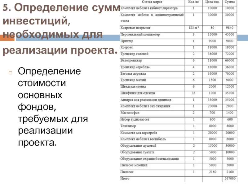 Слайд 95. Определение суммы инвестиций, необходимых для реализации проекта.