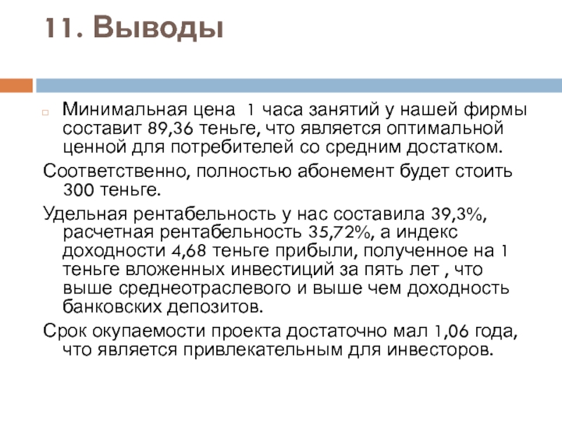 Удельная рентабельность у нас составила 39,3%, расчетная рентабельность 35,72%, а индекс доходности 4,68 теньге прибыли, полученное на 1 теньге вложенных инвестиций за пять лет , что выше среднеотраслевого и выше чем доходность банковских депозитов.