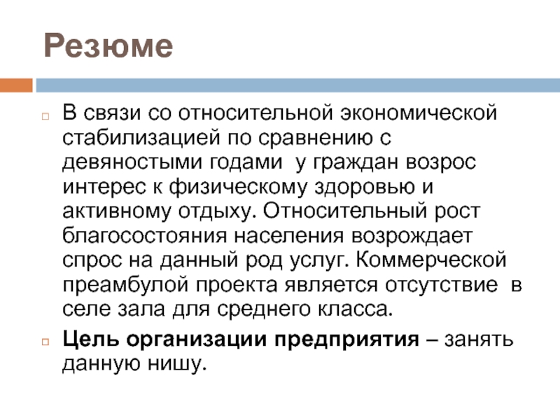 отдыху. Относительный рост благосостояния населения возрождает спрос на данный род услуг. Коммерческой преамбулой проекта является отсутствие в селе зала для среднего класса.