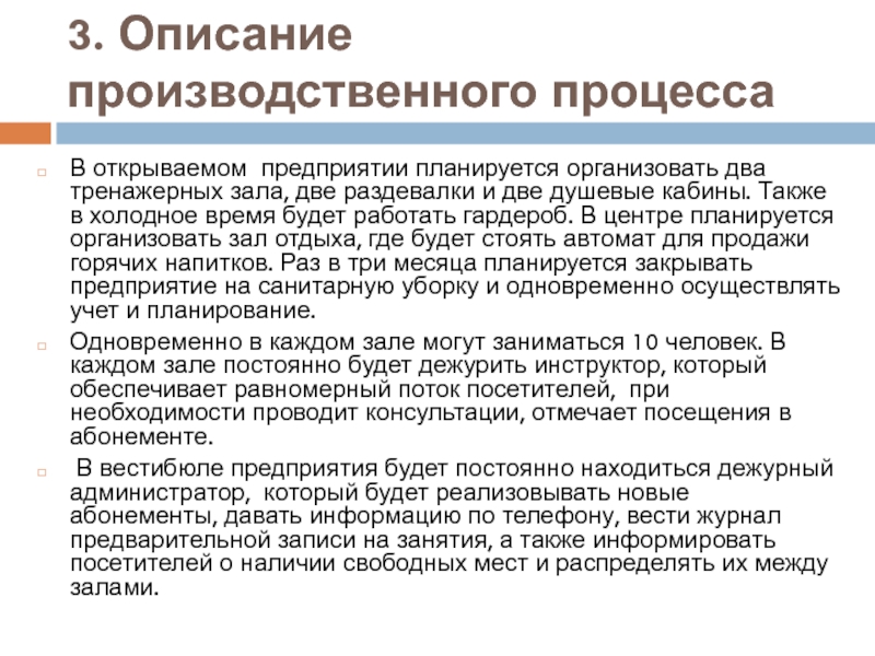 В вестибюле предприятия будет постоянно находиться дежурный администратор, который будет реализовывать новые абонементы, давать информацию по телефону, вести журнал предварительной записи на занятия, а также информировать посетителей о наличии свободных мест и распределять их между залами.