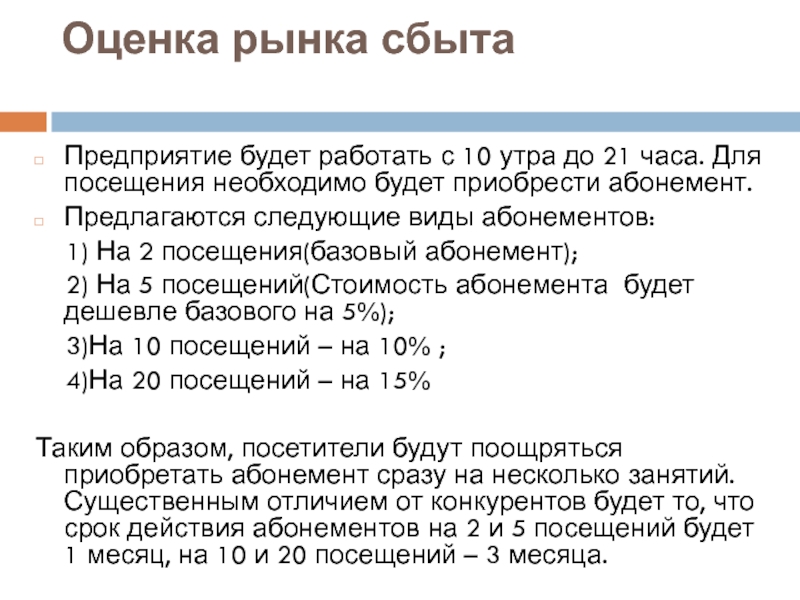 Таким образом, посетители будут поощряться приобретать абонемент сразу на несколько занятий. Существенным отличием от конкурентов будет то, что срок действия абонементов на 2 и 5 посещений будет 1 месяц, на 10 и 20 посещений – 3 месяца.