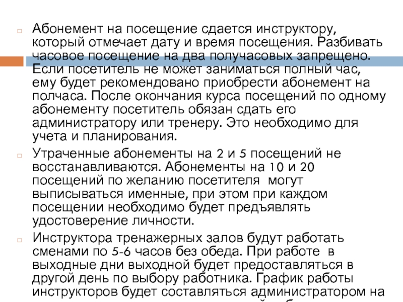 не может заниматься полный час, ему будет рекомендовано приобрести абонемент на полчаса. После окончания курса посещений по одному абонементу посетитель обязан сдать его администратору или тренеру. Это необходимо для учета и планирования.