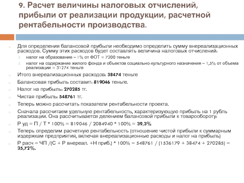 Слайд 189. Расчет величины налоговых отчислений, прибыли от реализации продукции, расчетной