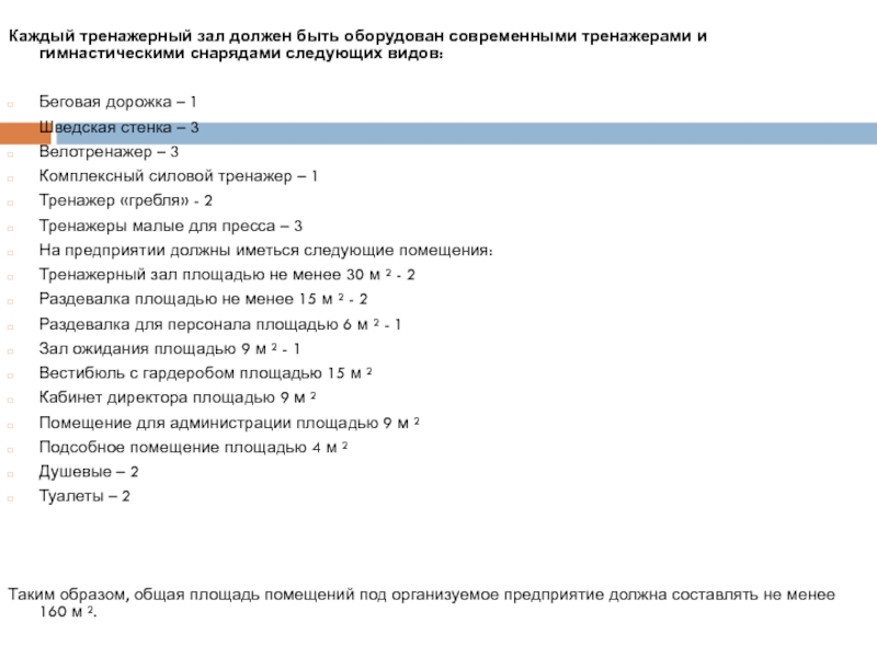 Таким образом, общая площадь помещений под организуемое предприятие должна составлять не менее 160 м ².