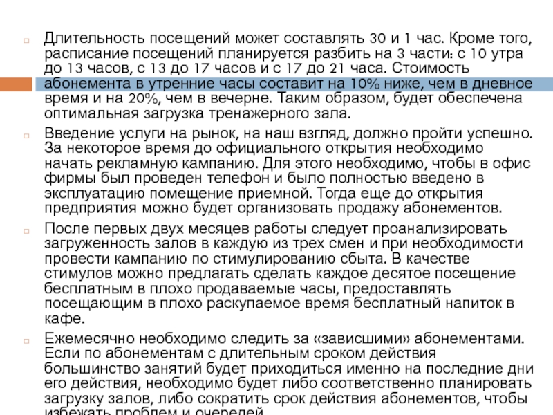 После первых двух месяцев работы следует проанализировать загруженность залов в каждую из трех смен и при необходимости провести кампанию по стимулированию сбыта. В качестве стимулов можно предлагать сделать каждое десятое посещение бесплатным в плохо продаваемые часы, предоставлять посещающим в плохо раскупаемое время бесплатный напиток в кафе.