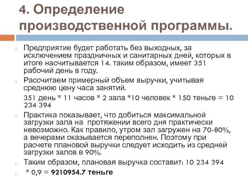 Практика показывает, что добиться максимальной загрузки зала на протяжении всего дня практически невозможно. Как правило, утром зал загружен на 70-80%, а вечерами оказывается переполнен. Поэтому при расчете плановой выручки следует исходить из средней загрузки залов в 90%.