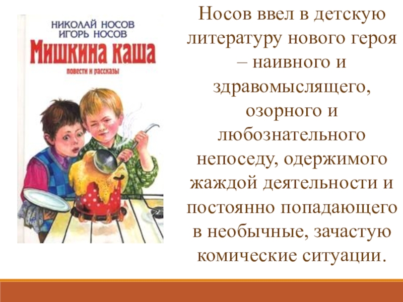 Слайд 9Носов ввел в детскую литературу нового героя – наивного и