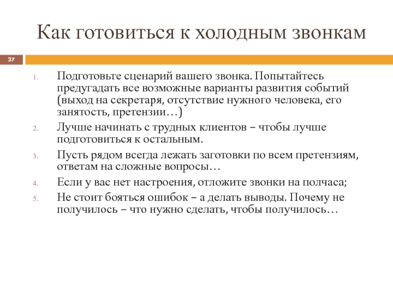 После презентации устанавливайте обратную связь, спрашивая клиента, как ему понравилось то, что он увидел. Каждая презентация должна быть тщательно подготовлена- никакого экспромта.