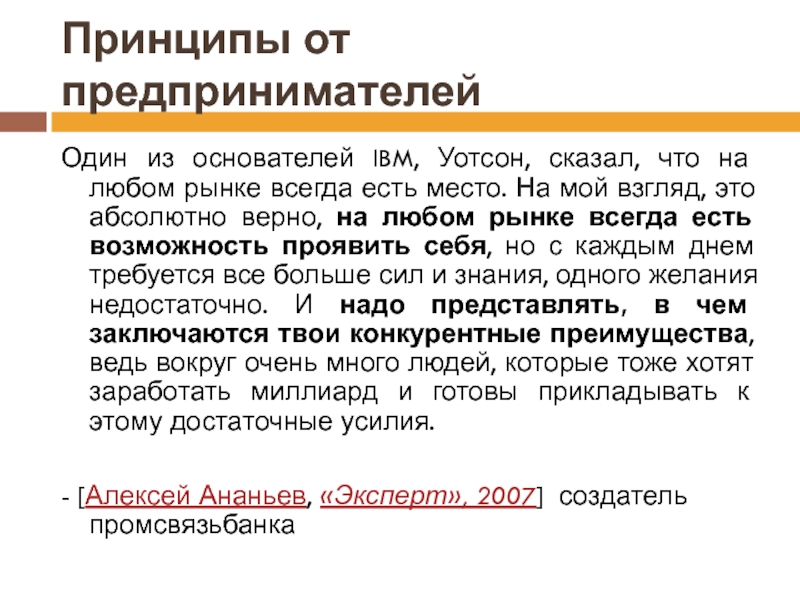маленькую нишу, в которой можно зарабатывать. Главное понять в чем ваш продукт лучше, чем у конкурентов. – Олег Тиньков «тезисы для начинающих предпринимателей» (olegtinkov.livejournal.com)