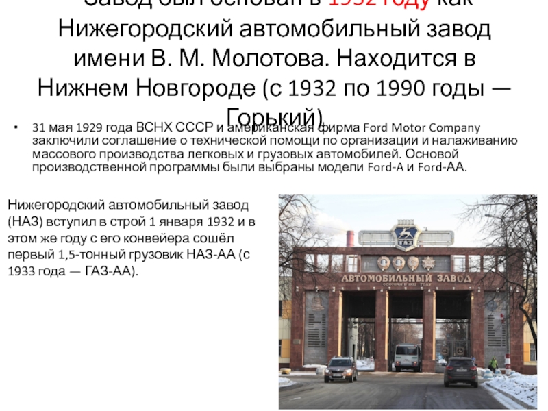 Слайд 30 Завод был основан в 1932 году как Нижегородский автомобильный