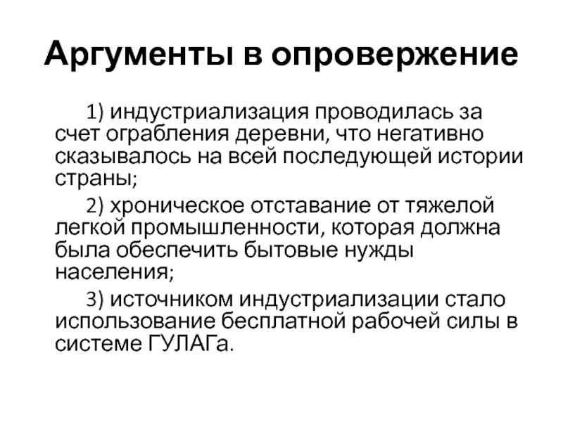 3) источником индустриализации стало использование бесплатной рабочей силы в системе ГУЛАГа.