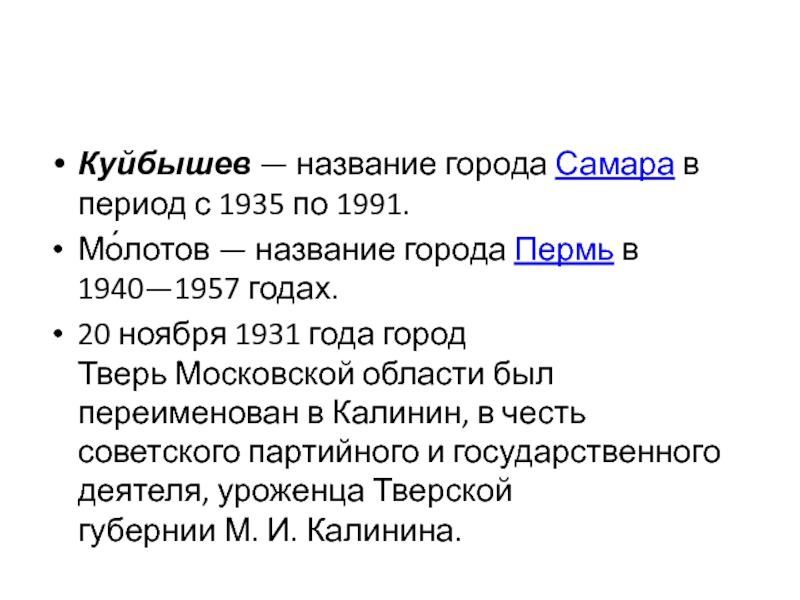 Слайд 90Куйбышев — название города Самара в период с 1935 по 1991.