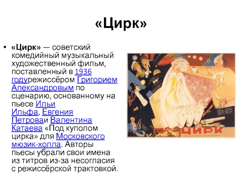 «Цирк» — советский комедийный музыкальный художественный фильм, поставленный в 1936 годурежиссёром Григорием Александровым по