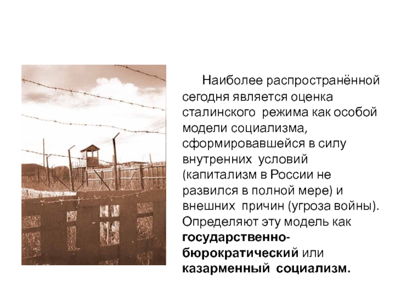 условий (капитализм в России не развился в полной мере) и внешних причин (угроза войны). Определяют эту модель как государственно- бюрократический или казарменный социализм.