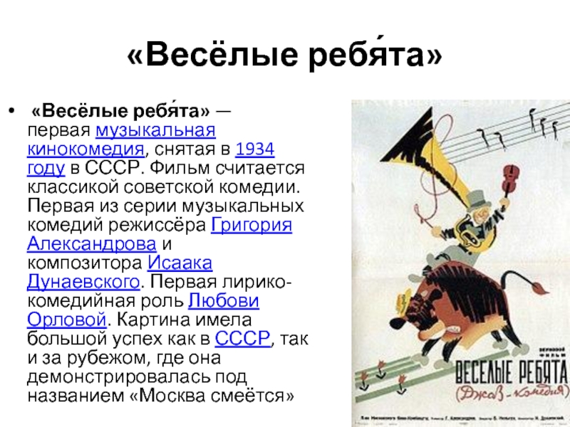 Александрова и композитора Исаака Дунаевского. Первая лирико-комедийная роль Любови Орловой. Картина имела большой успех как в СССР, так и за рубежом, где она демонстрировалась под названием «Москва смеётся»