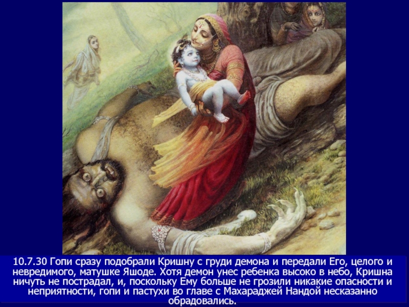 Слайд 1410.7.30 Гопи сразу подобрали Кришну с груди демона и передали