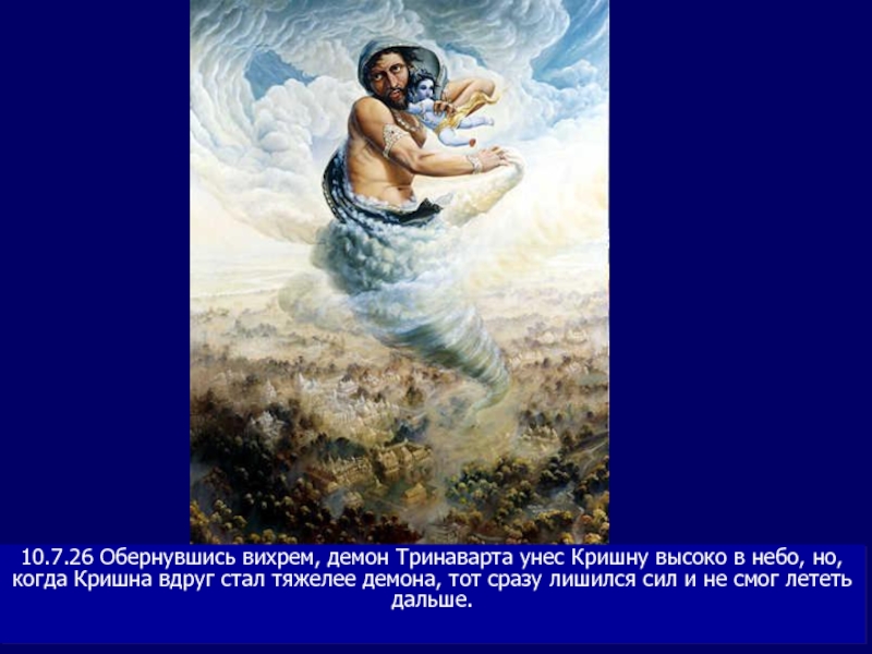 Слайд 1310.7.26 Обернувшись вихрем, демон Тринаварта унес Кришну высоко в небо,