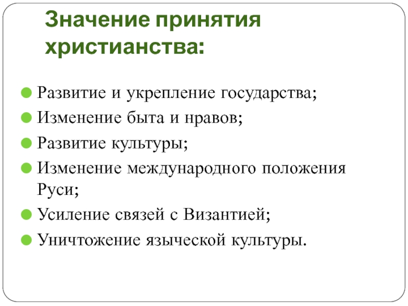 Значение принятия христианства:Развитие и укрепление государства;Изменение быта и нравов;Развитие культуры;Изменение международного положения Руси;Усиление связей с Византией;Уничтожение языческой