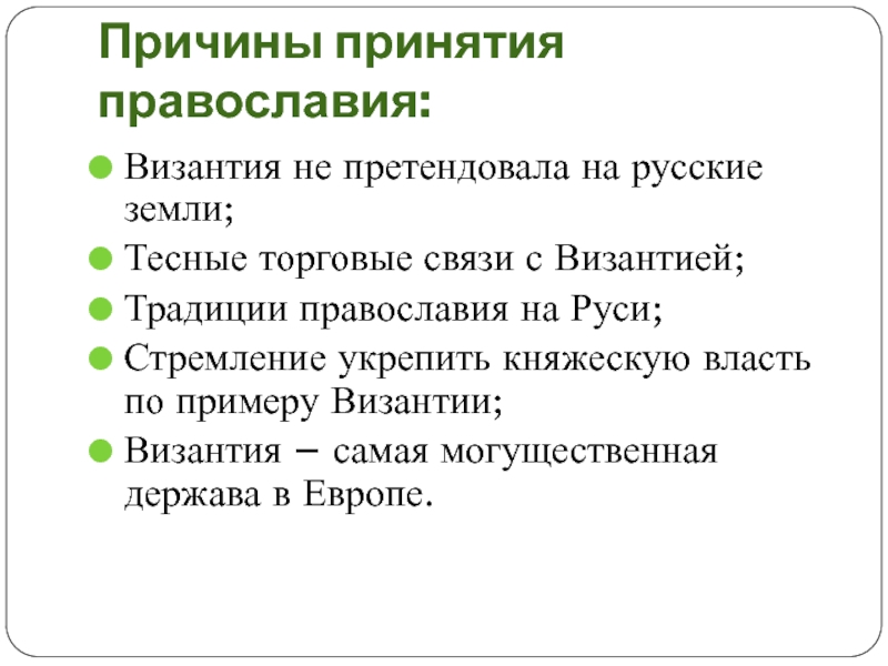 Причины принятия православия:Византия не претендовала на русские земли;Тесные торговые связи с Византией;Традиции православия на Руси;Стремление укрепить княжескую