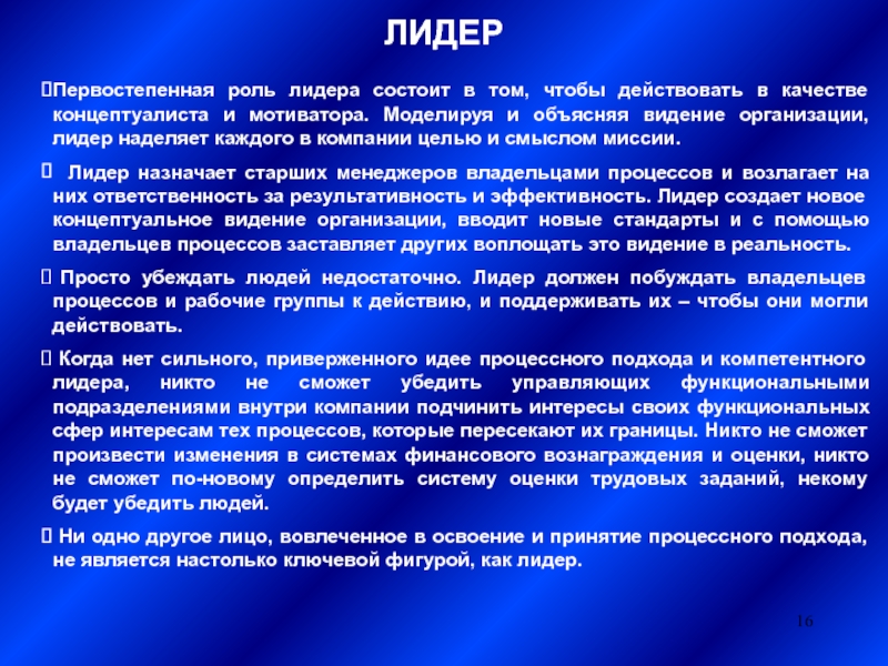 Ни одно другое лицо, вовлеченное в освоение и принятие процессного подхода, не является настолько ключевой фигурой, как лидер.