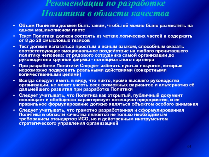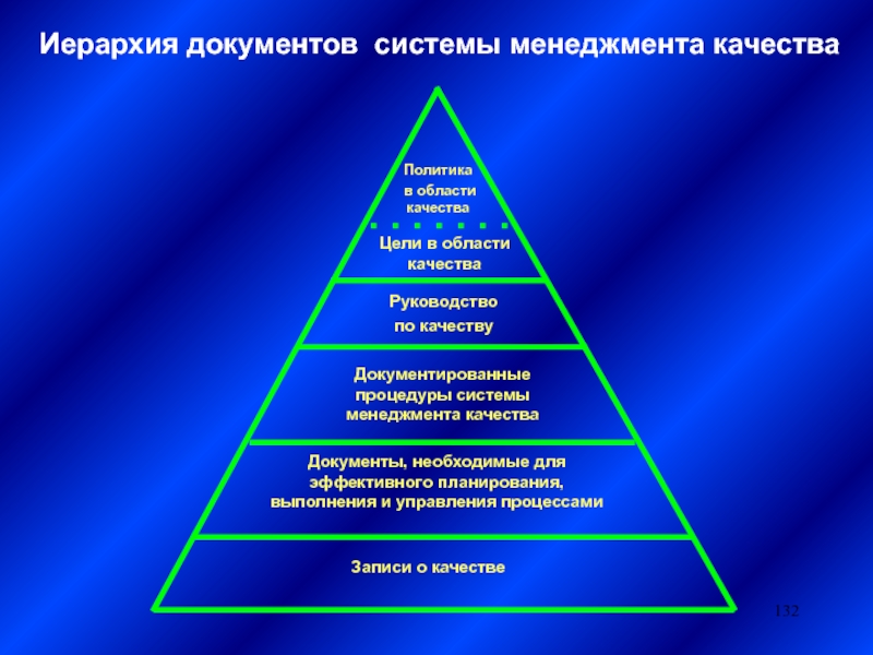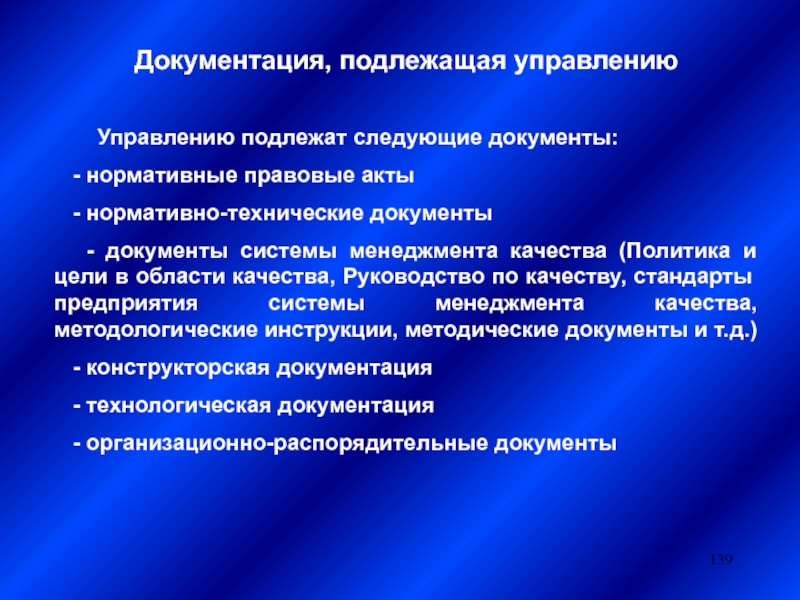 - документы системы менеджмента качества (Политика и цели в области качества, Руководство по качеству, стандарты предприятия системы менеджмента качества, методологические инструкции, методические документы и т.д.)