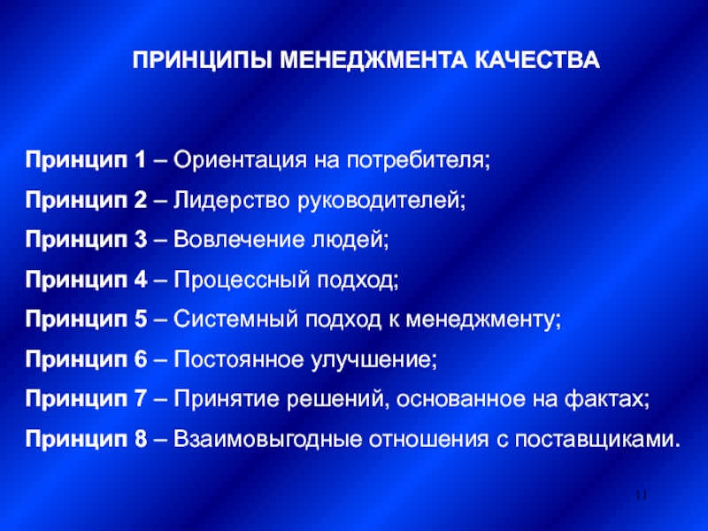 Слайд 11 ПРИНЦИПЫ МЕНЕДЖМЕНТА КАЧЕСТВА