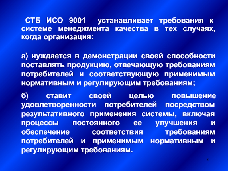 Слайд 8 СТБ ИСО 9001 устанавливает требования к системе менеджмента качества