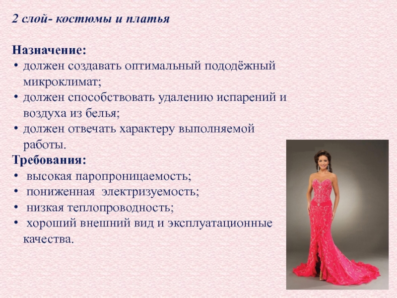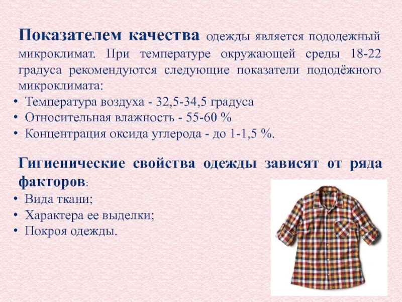 Слайд 4Показателем качества одежды является пододежный микроклимат. При температуре окружающей среды