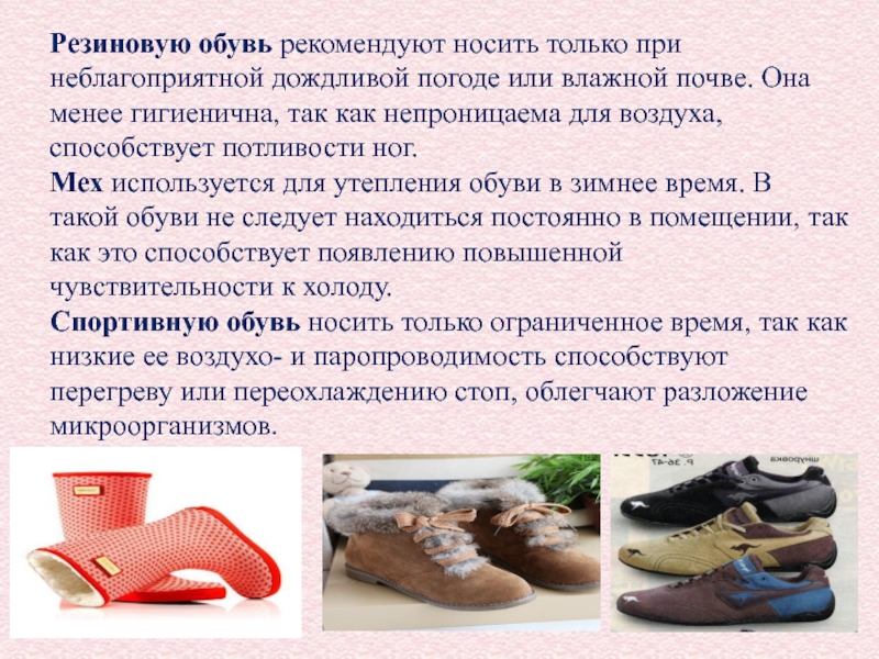 Слайд 28Резиновую обувь рекомендуют носить только при неблагоприятной дождливой погоде или