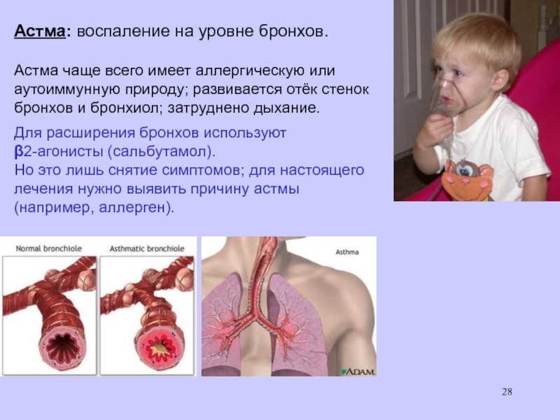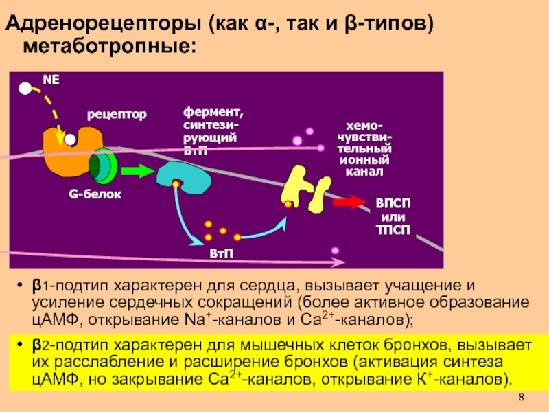 2-подтип характерен для мышечных клеток бронхов, вызывает их расслабление и расширение бронхов (активация синтеза цАМФ, но закрывание Са2+-каналов, открывание К+-каналов).