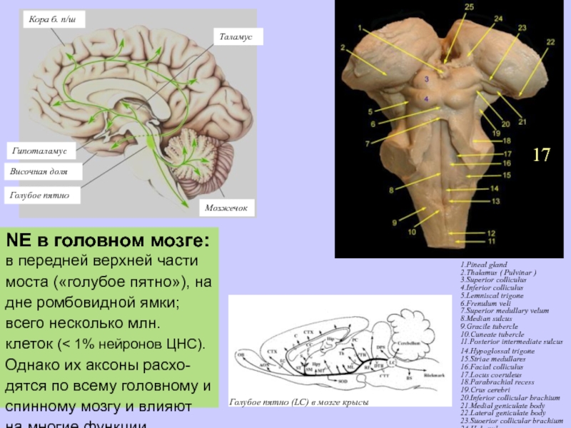В головном мозге NЕ-ней-роны расположены в голу-бом пятне (мост), но их аксоны широко ветвятся