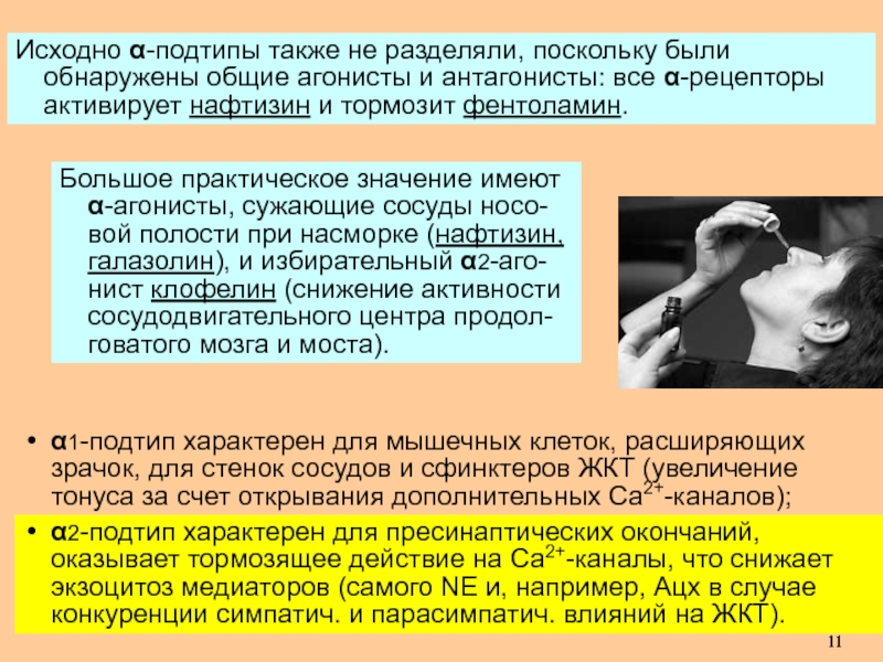 Исходно -подтипы также не разделяли, поскольку были обнаружены общие агонисты и антагонисты: все -рецепторы активирует нафтизин и тормозит фентоламин.