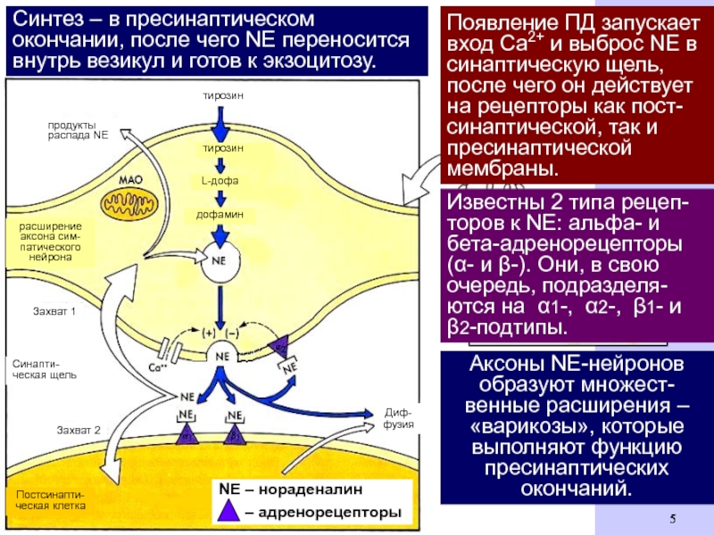 Появление ПД запускает вход Са2+ и выброс NЕ в синаптическую щель, после чего он действует на рецепторы как пост-синаптической, так и пресинаптической мембраны.
