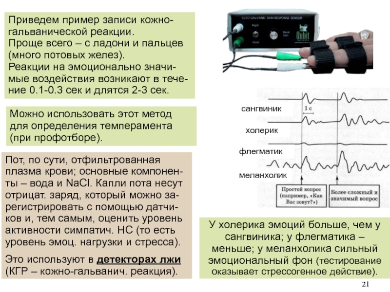 Пот, по сути, отфильтрованная плазма крови; основные компонен-ты – вода и NaCl. Капли пота несут отрицат. заряд, который можно за-регистрировать с помощью датчи-ков и, тем самым, оценить уровень активности симпатич. НС (то есть уровень эмоц. нагрузки и стресса).