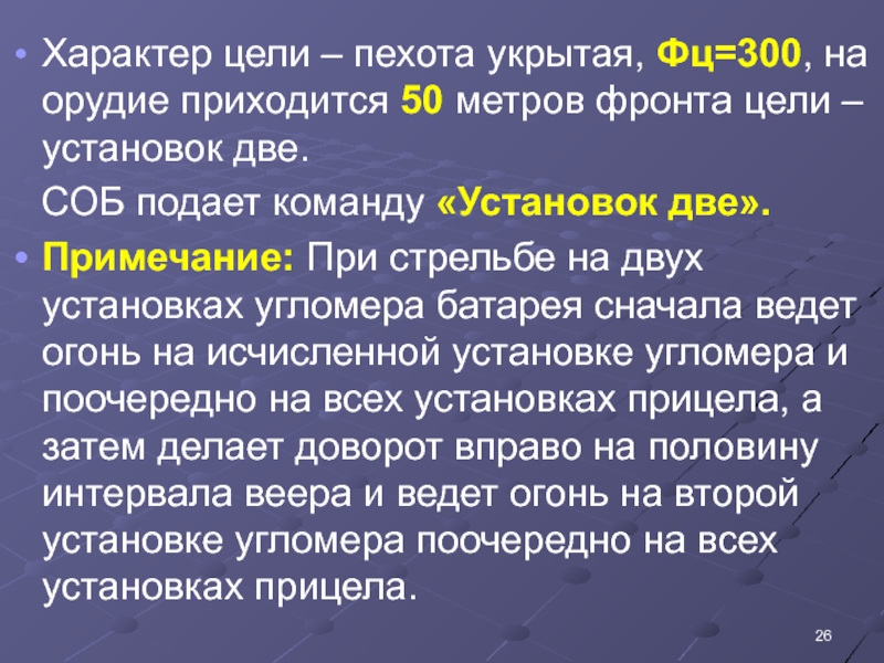 Слайд 26Характер цели – пехота укрытая, Фц=300, на орудие приходится 50