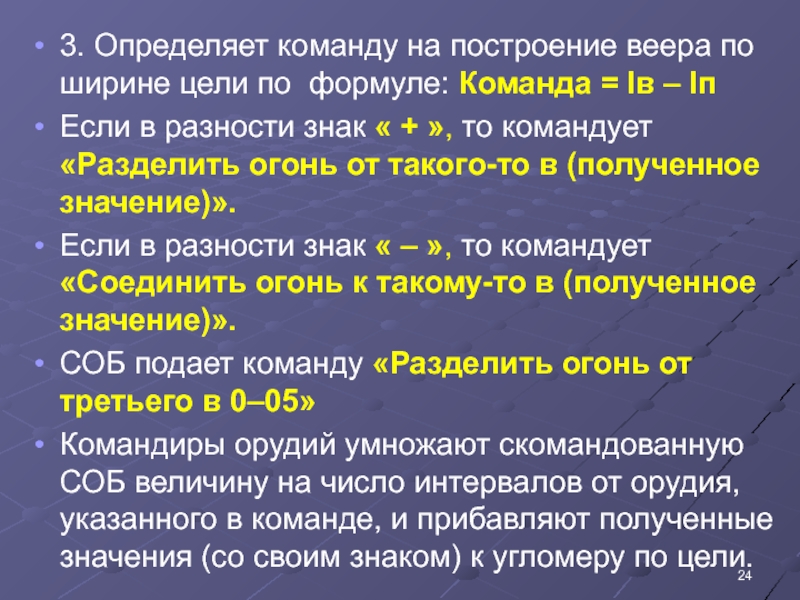 Командиры орудий умножают скомандованную СОБ величину на число интервалов от орудия, указанного в команде, и прибавляют полученные значения (со своим знаком) к угломеру по цели.