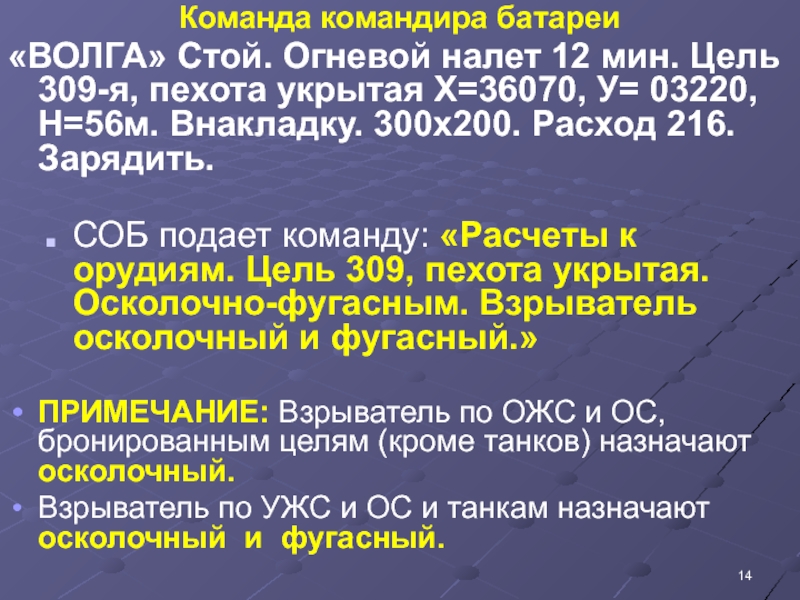 СОБ подает команду: «Расчеты к орудиям. Цель 309, пехота укрытая. Осколочно-фугасным. Взрыватель осколочный и фугасный.»