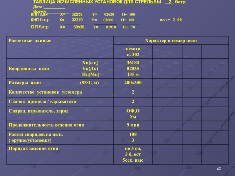 Слайд 34 2–ой вопрос : Расчет исчисленных установок для стрельбы, заполнение