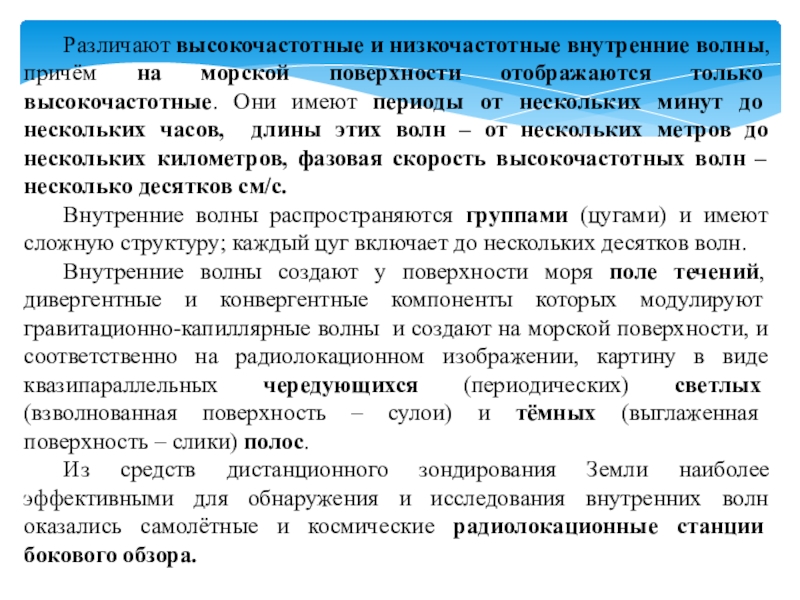 Слайд 40 Различают высокочастотные и низкочастотные внутренние волны, причём на морской поверхности
