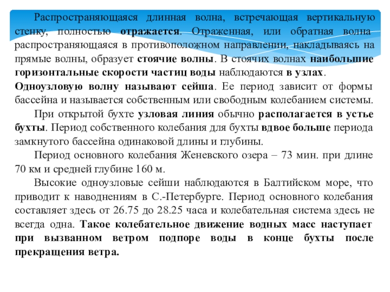 образует стоячие волны. В стоячих волнах наибольшие горизонтальные скорости частиц воды наблюдаются в узлах. Одноузловую волну называют сейша. Ее период зависит от формы бассейна и называется собственным или свободным колебанием системы.