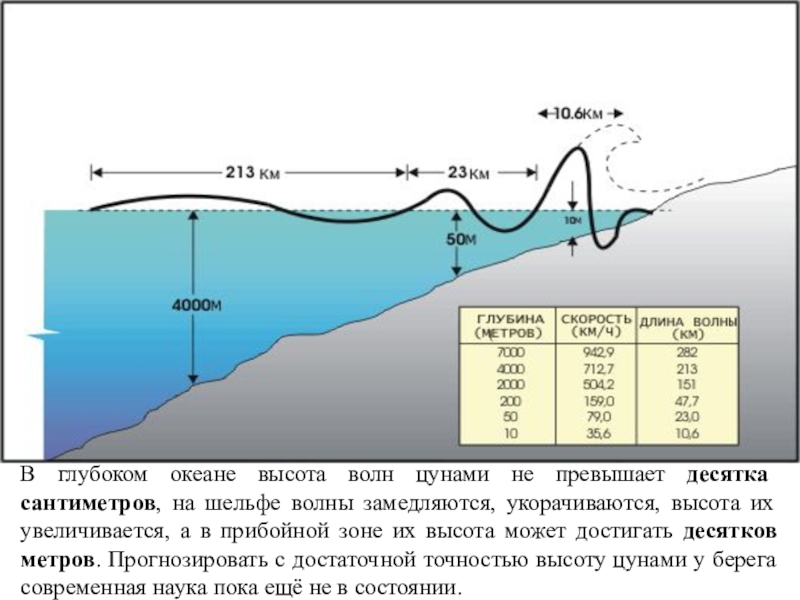 прибойной зоне их высота может достигать десятков метров. Прогнозировать с достаточной точностью высоту цунами у берега современная наука пока ещё не в состоянии.