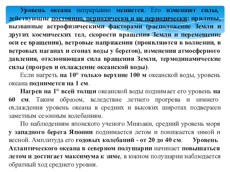 Слайд 7 Уровень океана непрерывно меняется. Его изменяют силы, действующие постоянно, периодически
