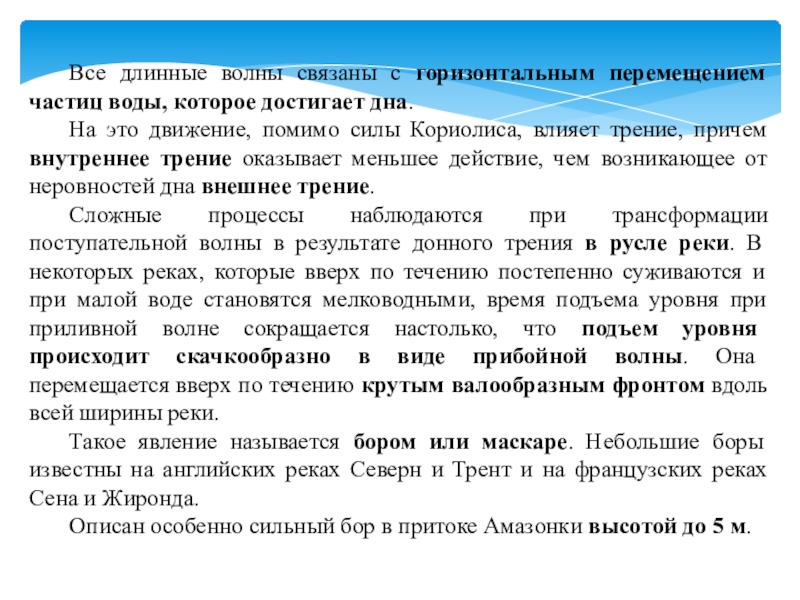 Сложные процессы наблюдаются при трансформации поступательной волны в результате донного трения в русле реки. В некоторых реках, которые вверх по течению постепенно суживаются и при малой воде становятся мелководными, время подъема уровня при приливной волне сокращается настолько, что подъем уровня происходит скачкообразно в виде прибойной волны. Она перемещается вверх по течению крутым валообразным фронтом вдоль всей ширины реки.